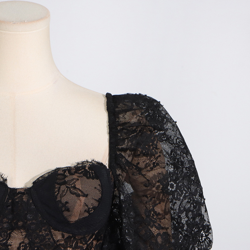 Party Dress Summer Square Collar Puff Sleeve High Waist Refined Handmade Lace Short Dress