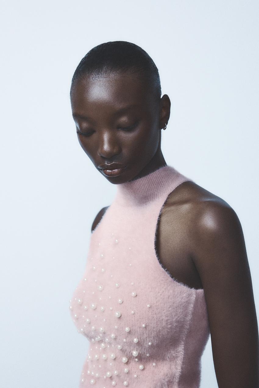 Pella Women’s Decorated Pearls Artificial Fur Effect Hanging Collar Sexy Knitted Vest Top