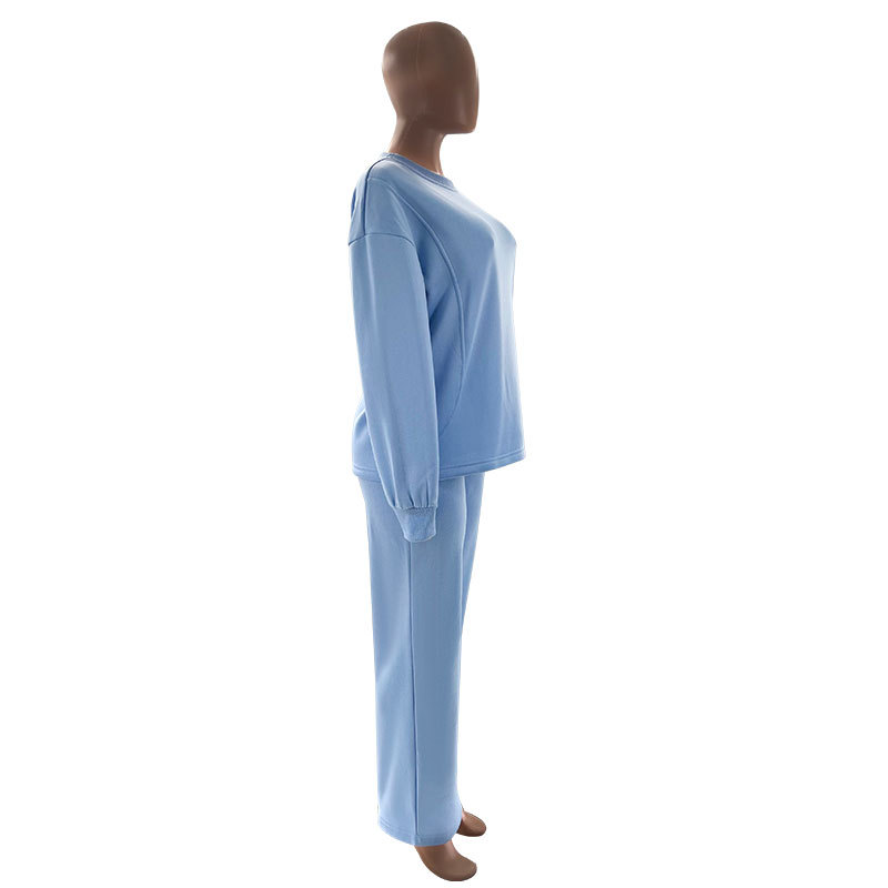 Autumn Winter Solid Color Round Neck Long Sleeve Loose Women Wear Casual Wide Leg Pants Suit