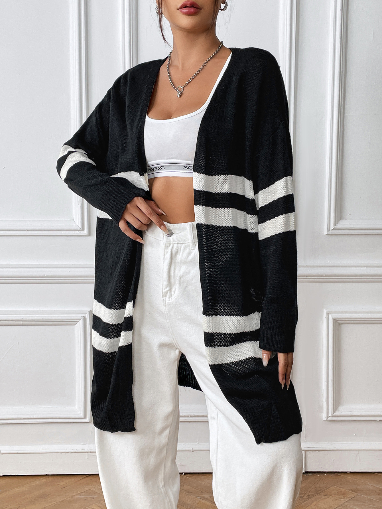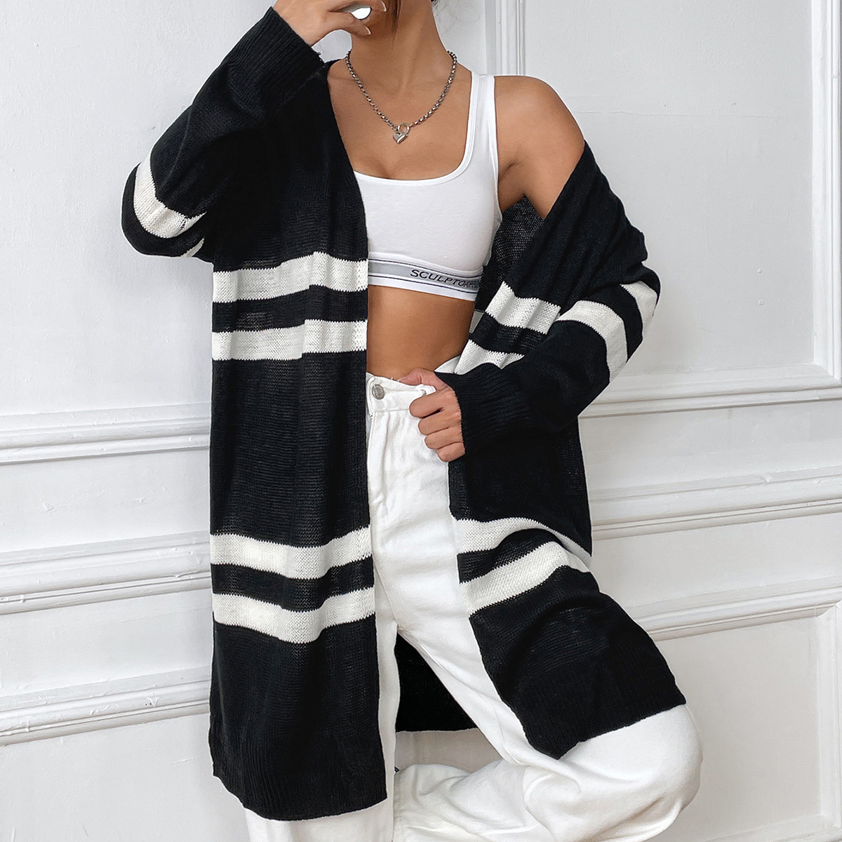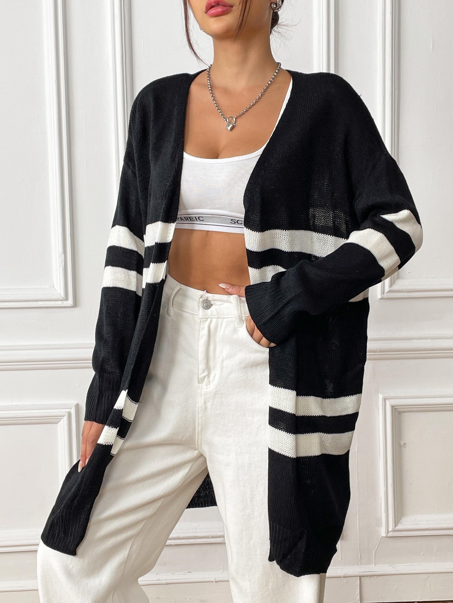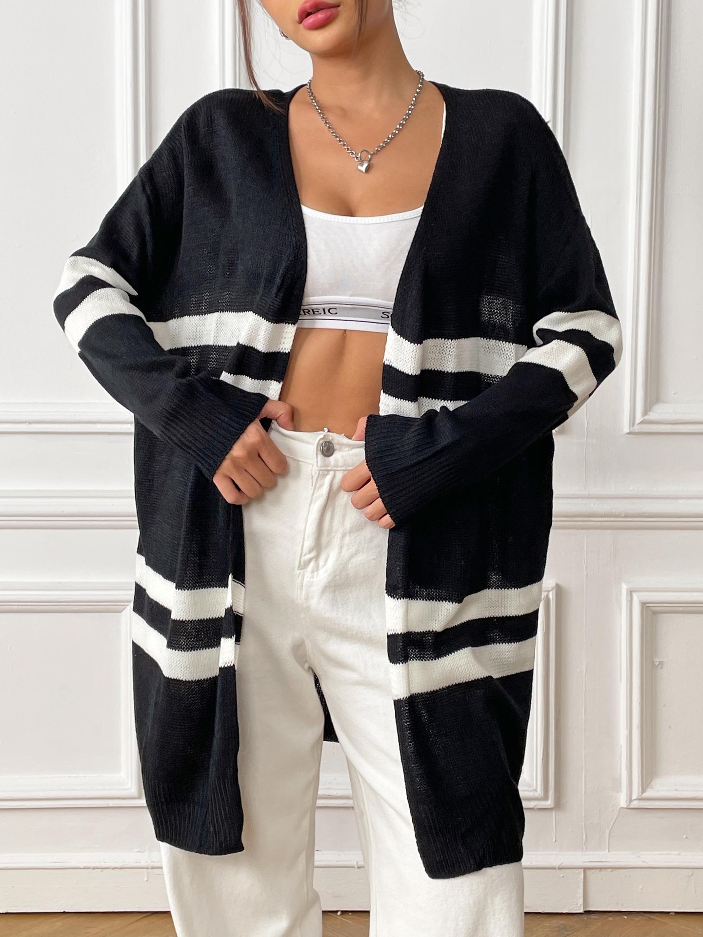 Women Cardigan Women Clothing Spring Autumn Striped Color Contrast Patchwork Woven Shirt Loose Casual Sweater Coat