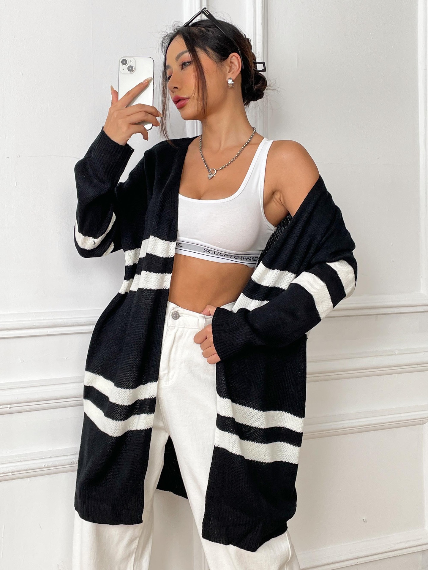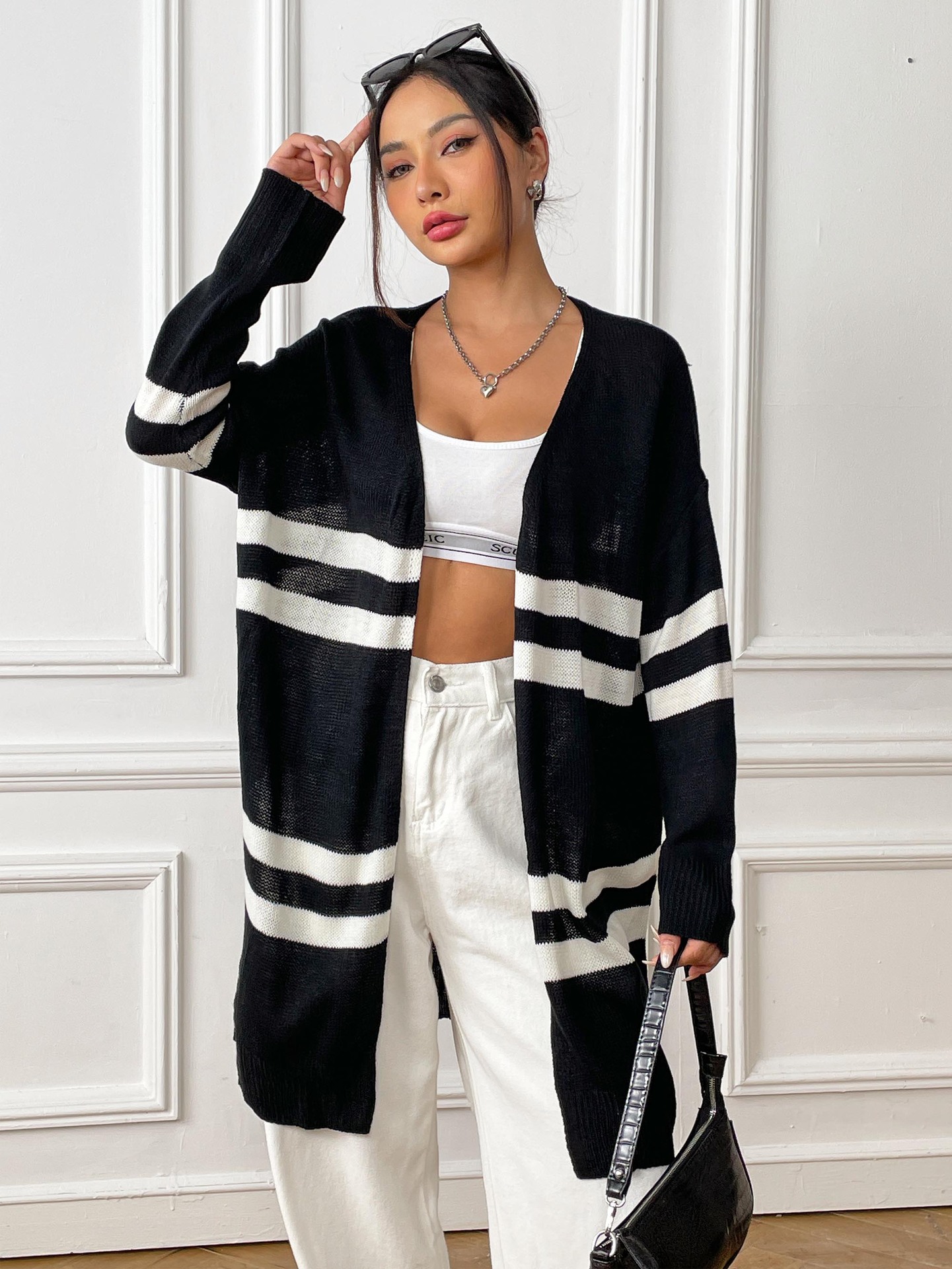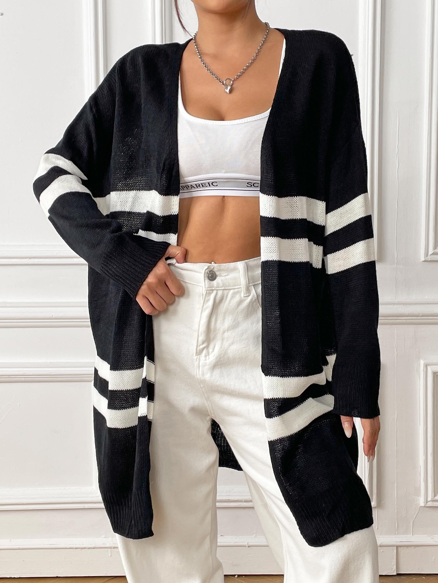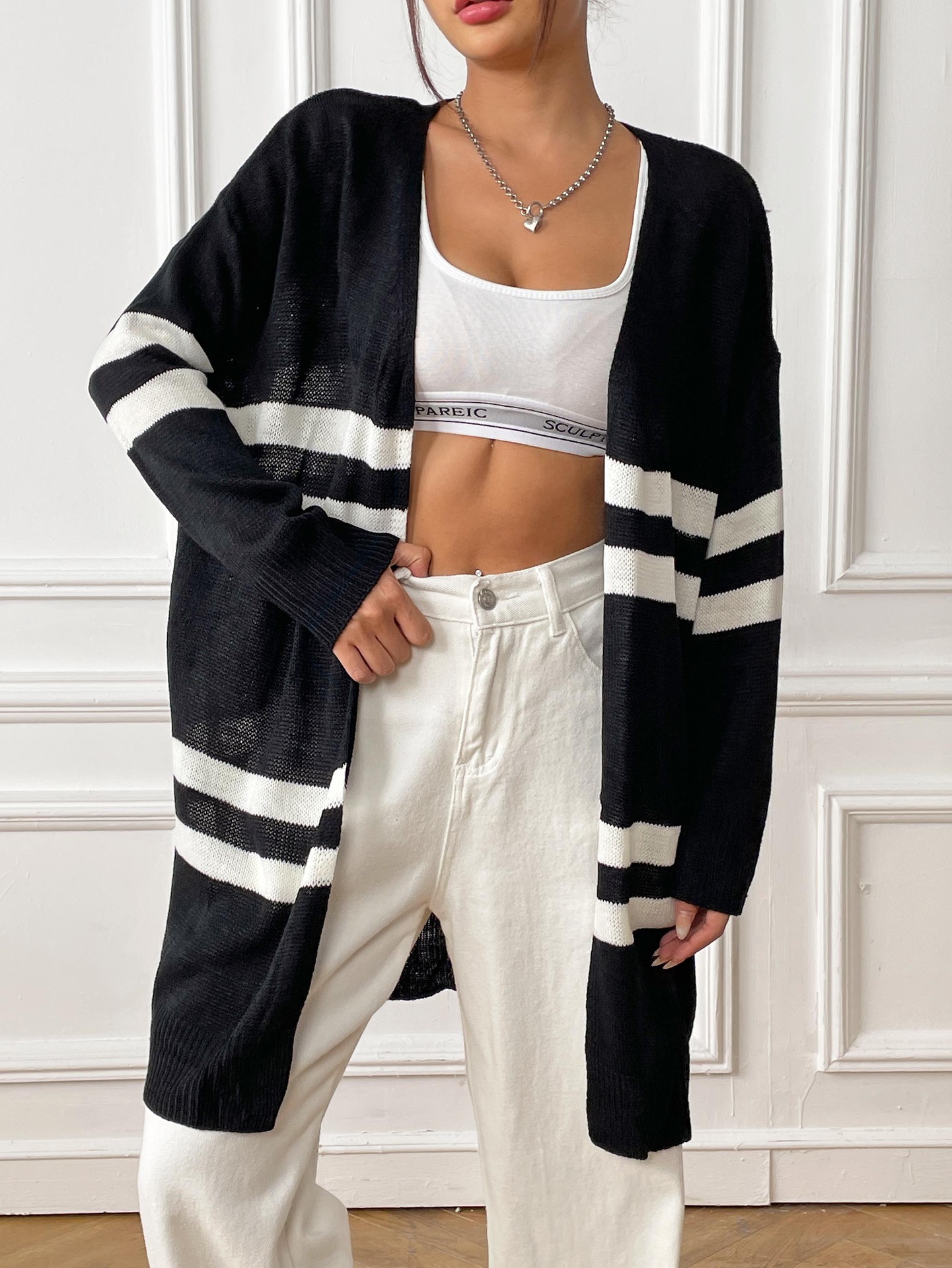 Women Cardigan Women Clothing Spring Autumn Striped Color Contrast Patchwork Woven Shirt Loose Casual Sweater Coat