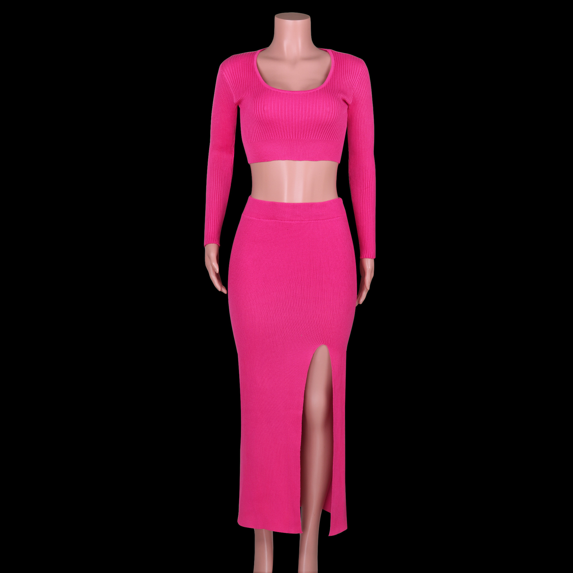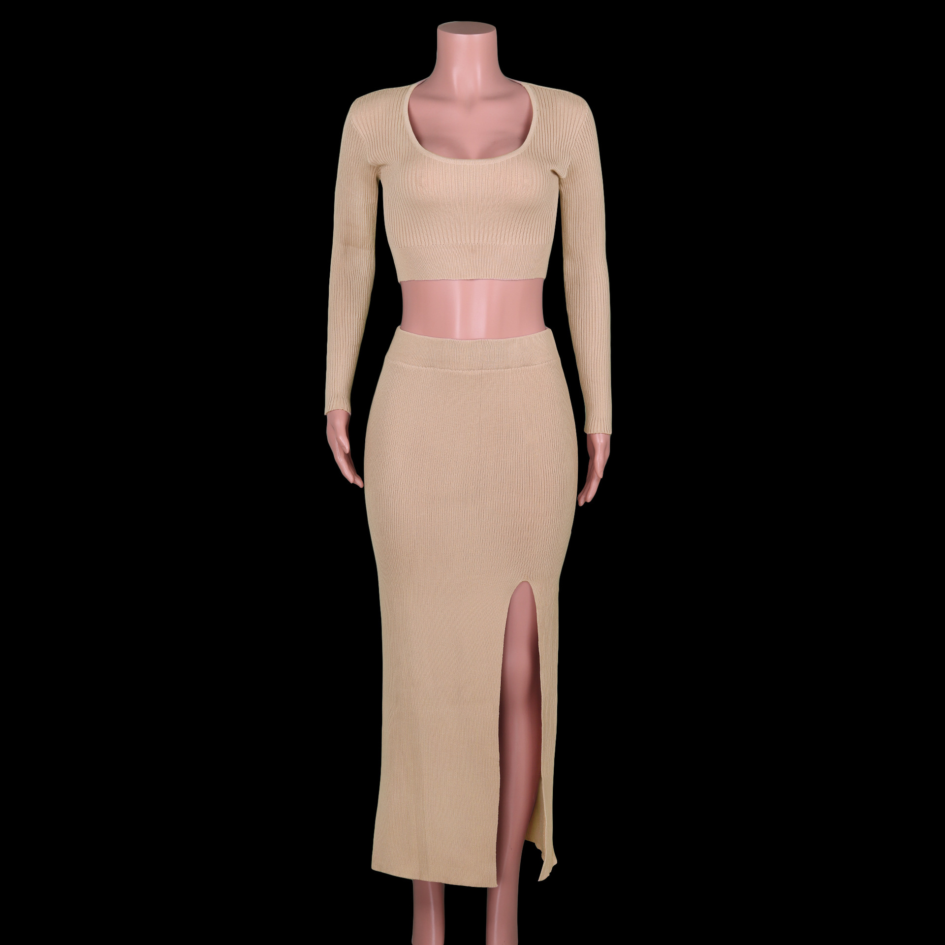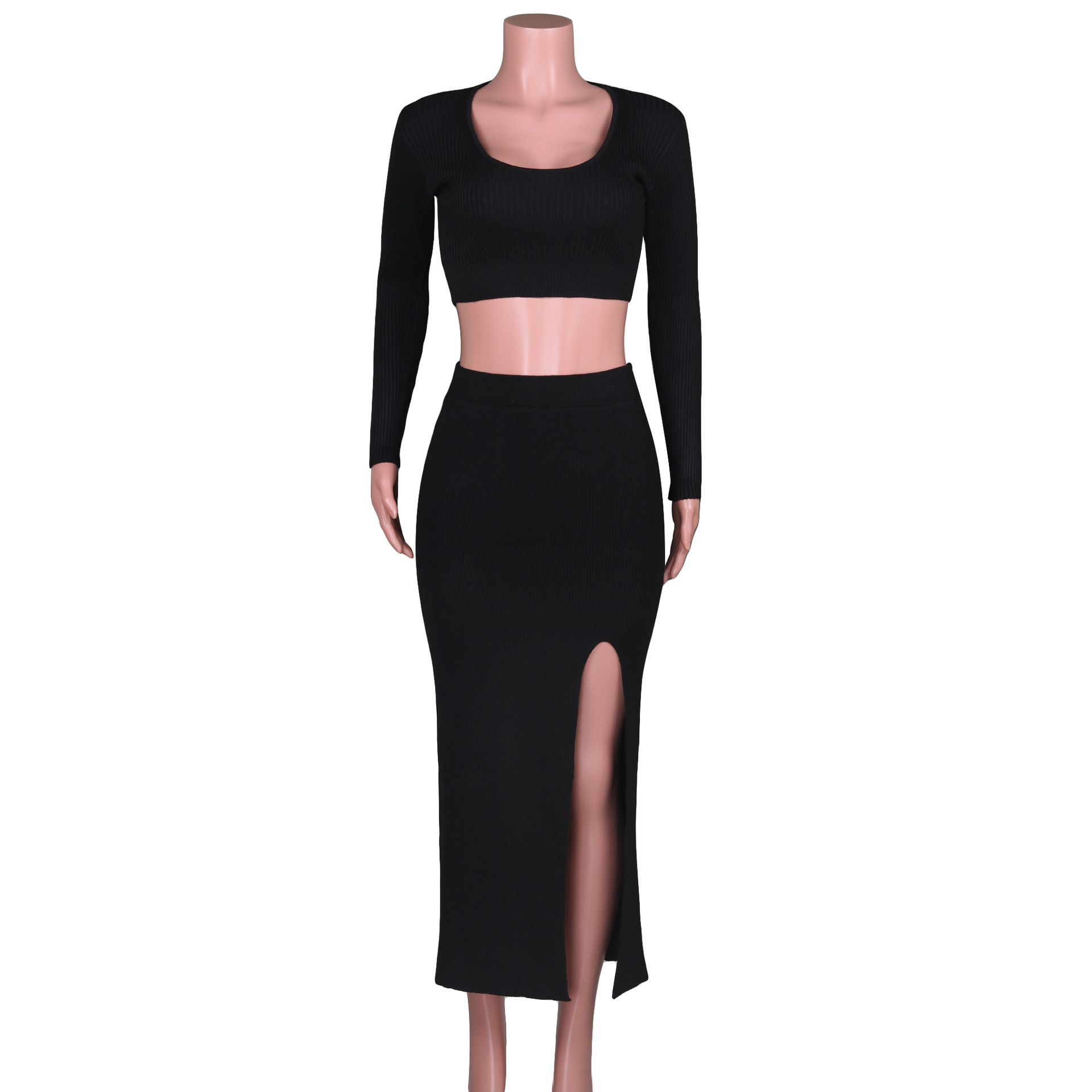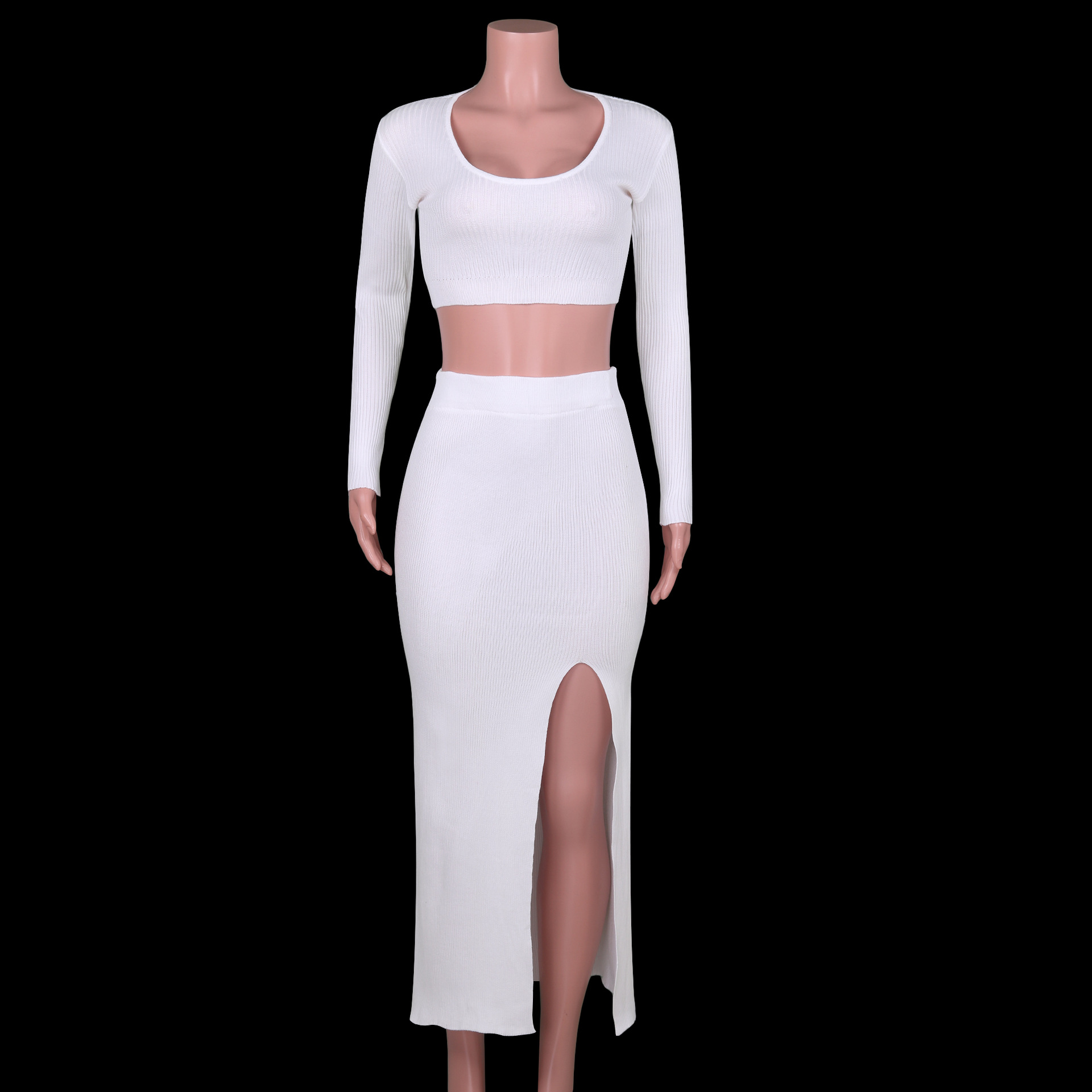 Mita Long Sleeve Sexy Crop Top Slit Long Skirt Sweater Two-Piece Set