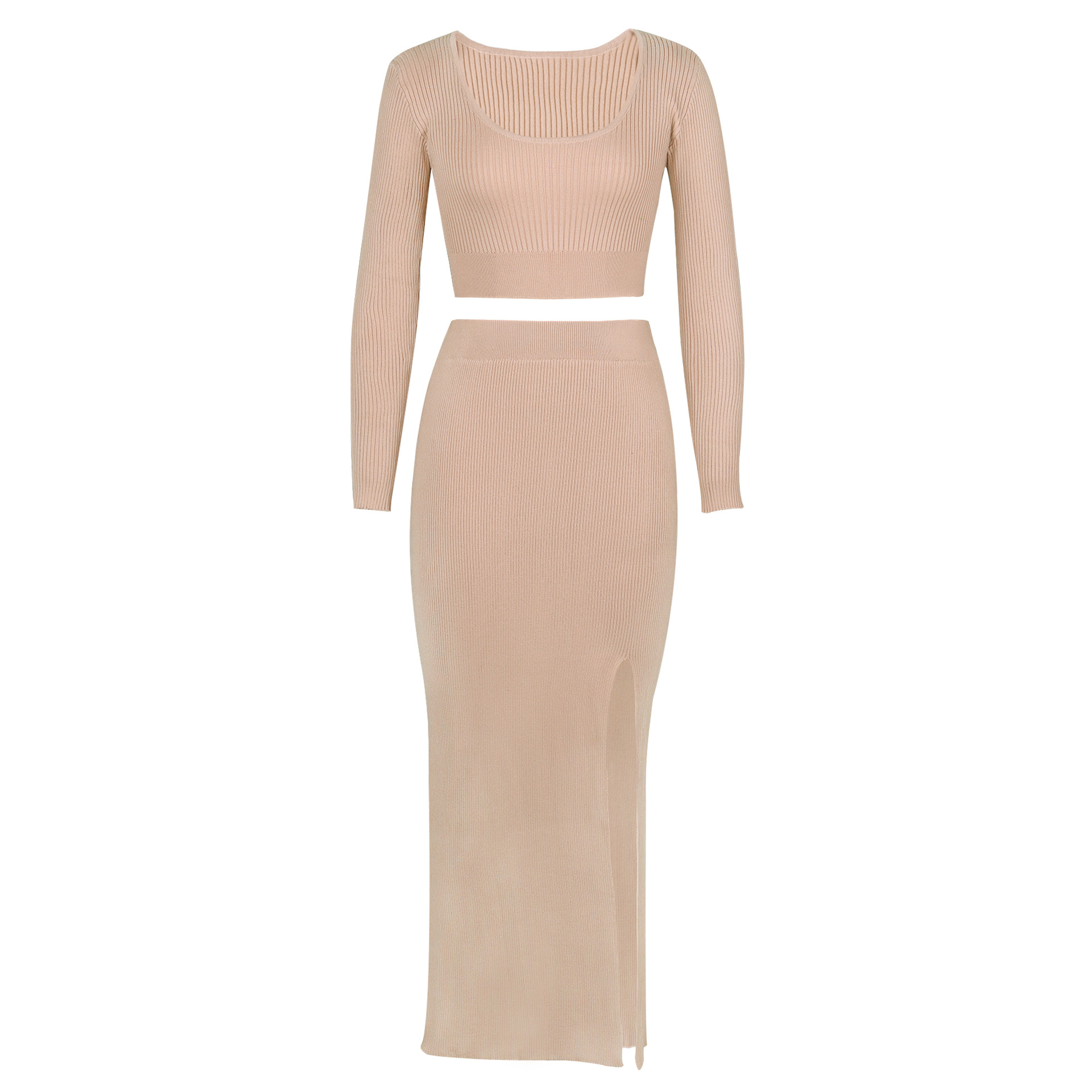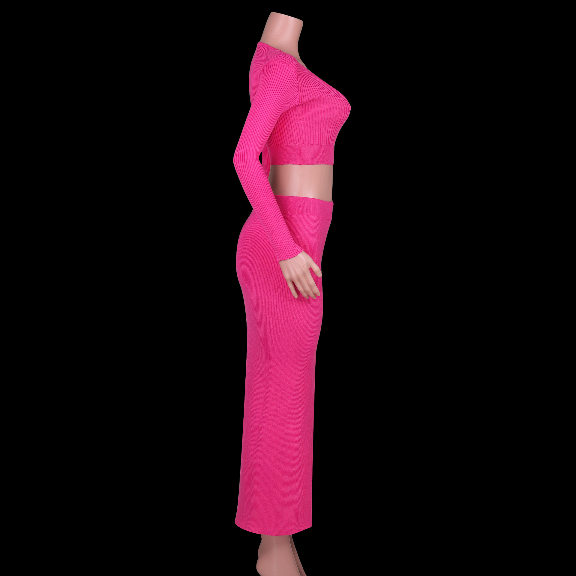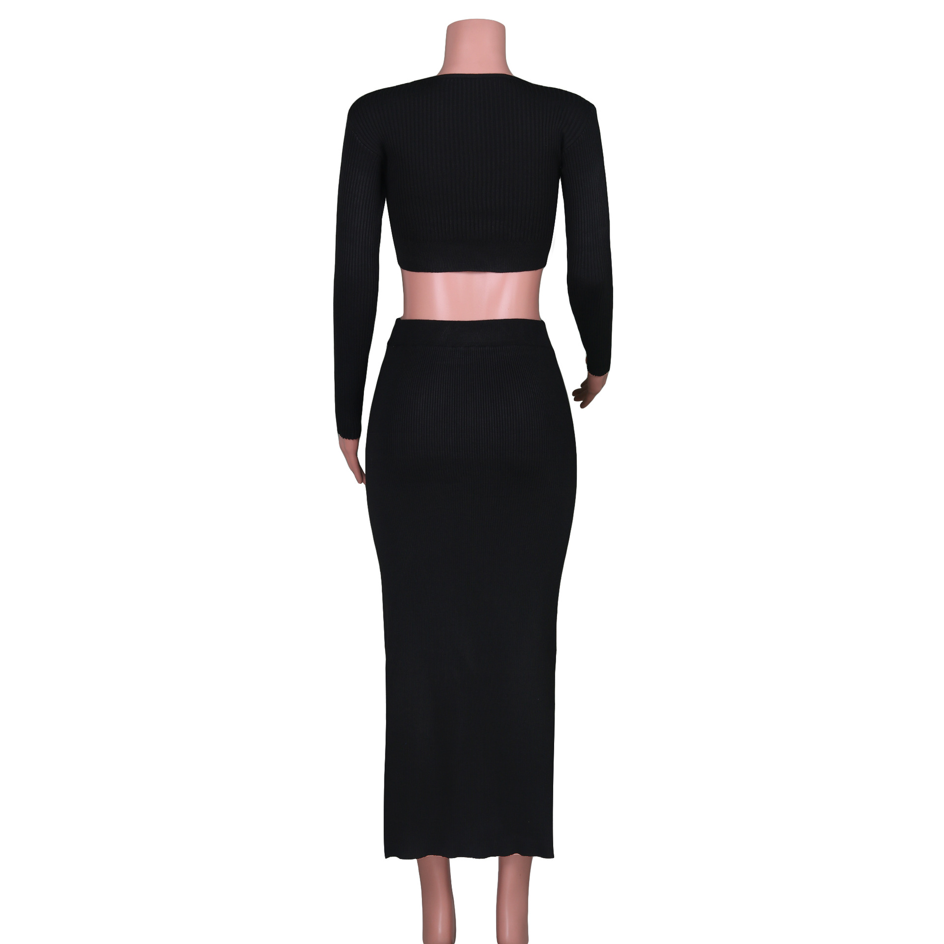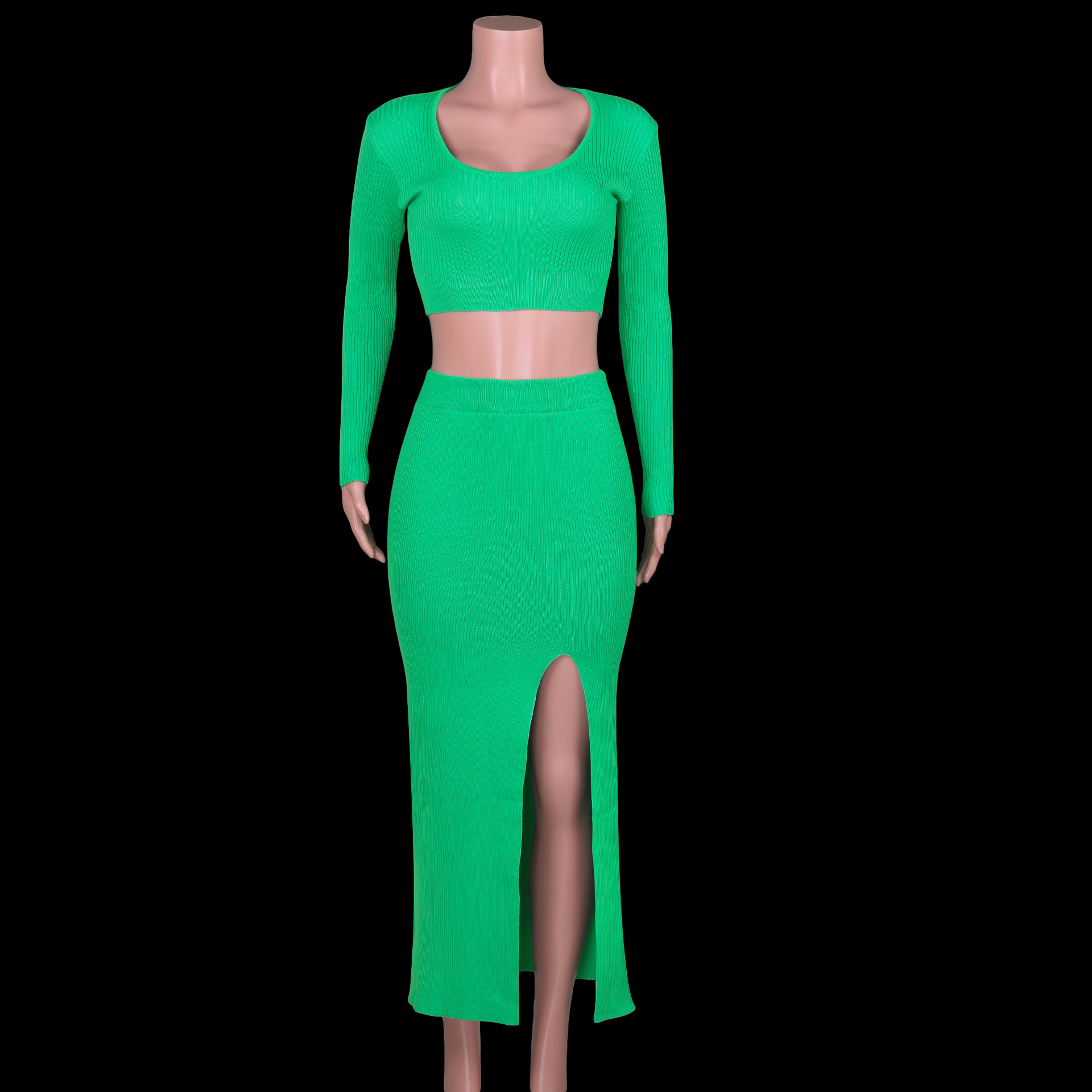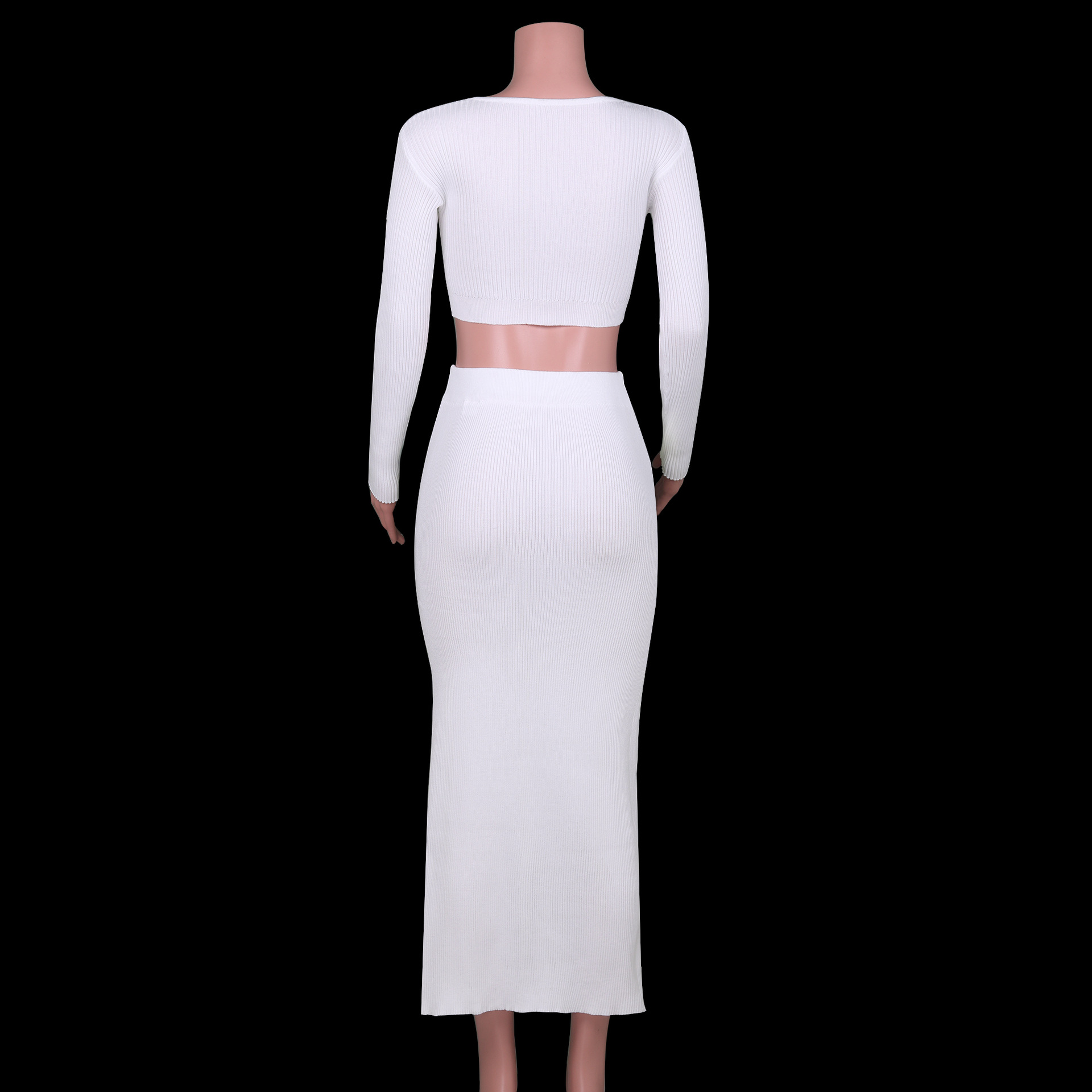 Mita Long Sleeve Sexy Crop Top Slit Long Skirt Sweater Two-Piece Set