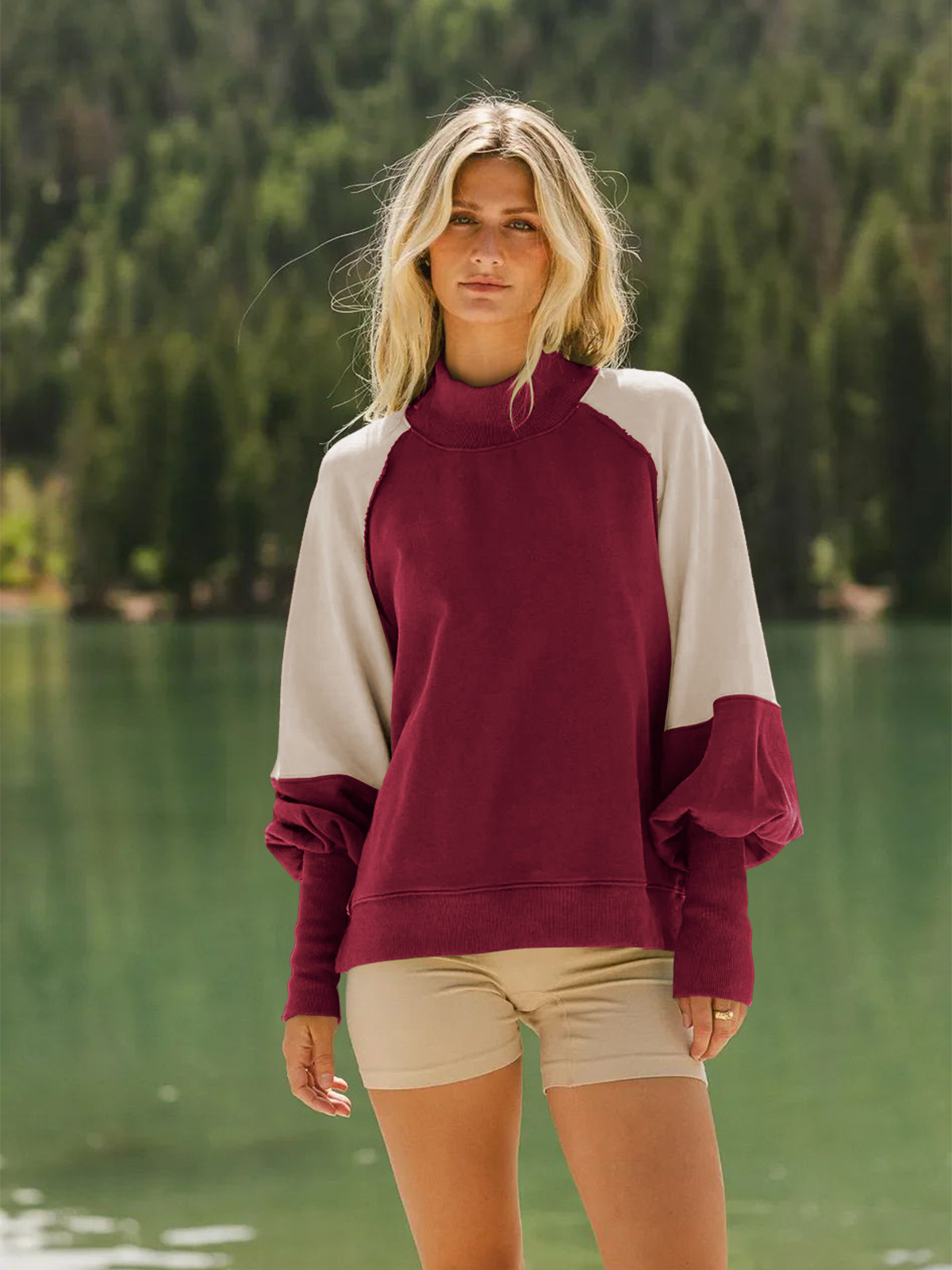 Women Clothing Contrast Color Lantern Sleeve Half High Collar Long Sleeves Sweater Casual Office Women